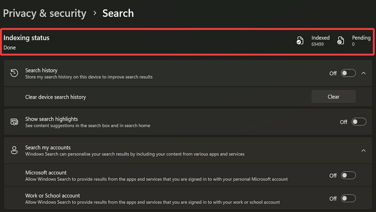 You can monitor your search indexing status in Settings > Privacy & security > Search. You'll see it at the top of the page, with a number of indexed and pending files.