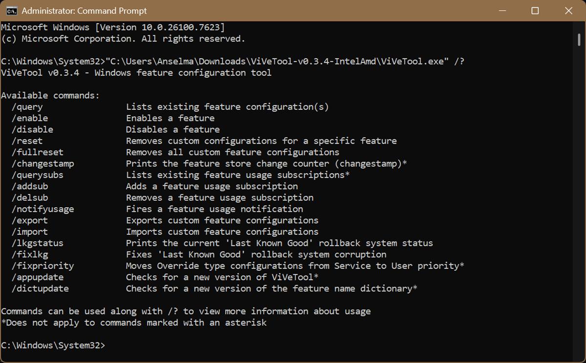 - To view a list of all the available commands, type: "full path for vivetool.exe" /? and press Enter. Replace the placeholder in the quote marks with the actual file path. For example, in my case, the command looked like this: "C:\Users\Anselma\Downloads\ViVeTool-v0.3.4-IntelAmd\ViVeTool.exe" /?
