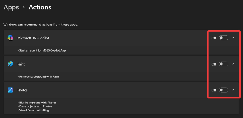 - To remove AI actions: Toggle off all app actions, including Microsoft 365 Copilot, Paint, and Photos.