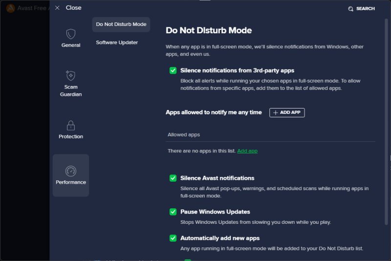 The Do Not Disturb mode is pretty sweet too, especially if you are gaming or presenting. Just open Avast, click Menu, Settings, and go to Performance. Once enabled, it stops Avast pop ups and prevents the Windows notification bar from stealing focus. It also reduces background scanning, which can help prevent those annoying FPS stutters caused by sudden CPU or disk spikes during checks or updates. It keeps everything quiet so you can stay focused.