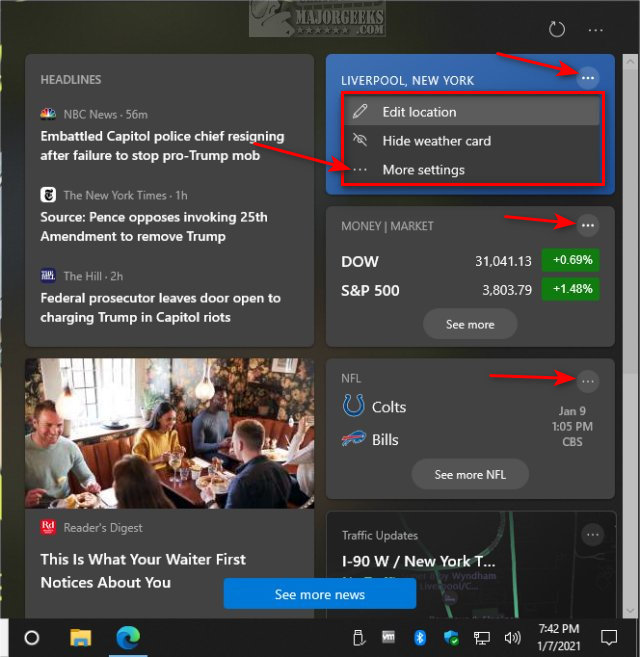 Open News and interest and look for the three dots in the top-right corner of any card. Instead of managing one card at a time, click on More settings.