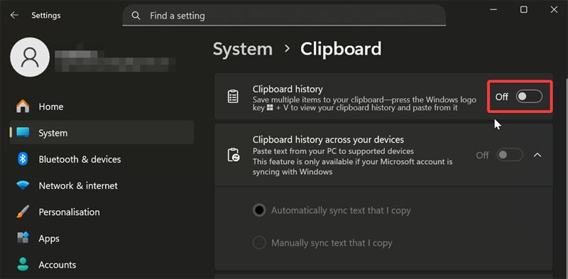- Toggle off Clipboard history.