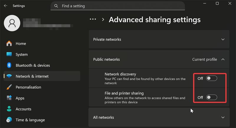 - Under Public networks, toggle off Network discovery and File and printer sharing.