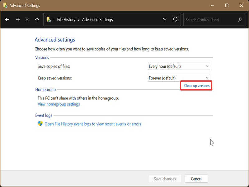Cleaning up the history is fairly simple, once you know where to look. Unfortunately, Windows has kinda swept the feature under the rug for the sake of prioritizing OneDrive. You can now only find File History in the place where legacy features go to die: the Control Panel.