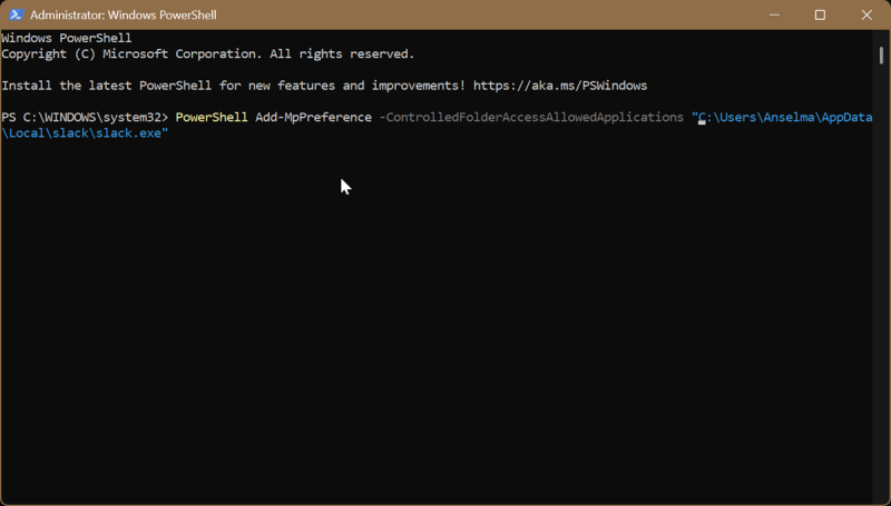 - To add an allowed app, type the following command and hit Enter: PowerShell Add-MpPreference -ControlledFolderAccessAllowedApplications "*full path*"