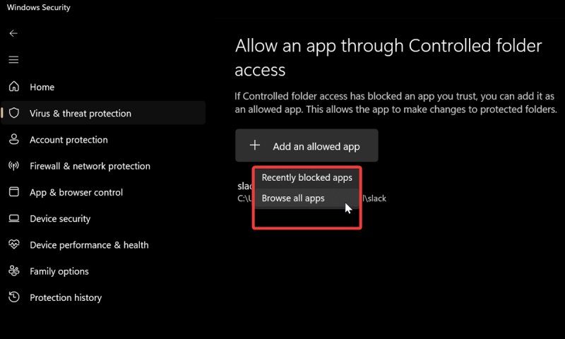 - Under Controlled folder access, select Allow an app through Controlled folder access.