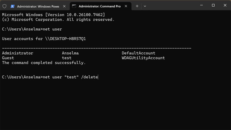 - To delete a local or Microsoft account, type: net user "UserName" /delete