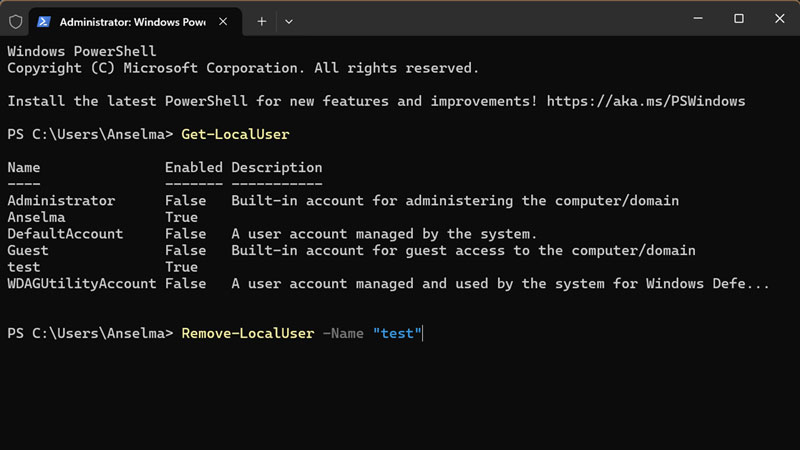 - Now, type Remove-LocalUser -Name "UserName" and press Enter. Make sure you insert the real account name instead of "UserName."