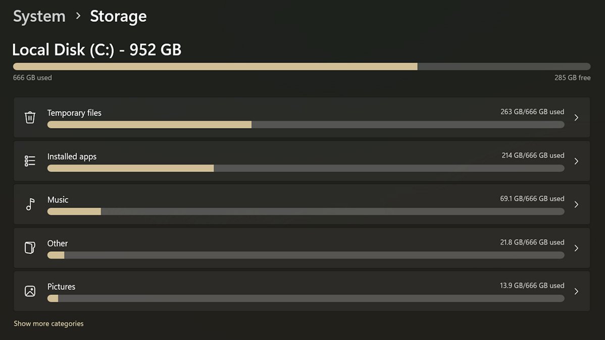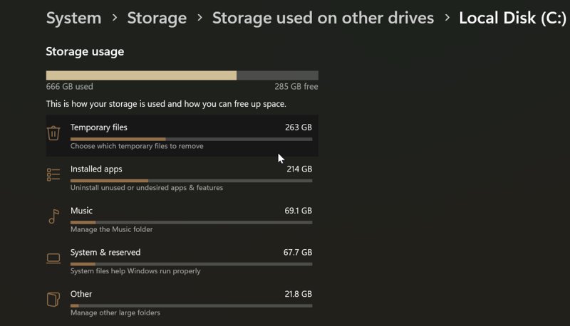 - You should see your system drive at the top of the page, with different categories like Temporary files, Installed apps, Music, etc. Click on Temporary files.