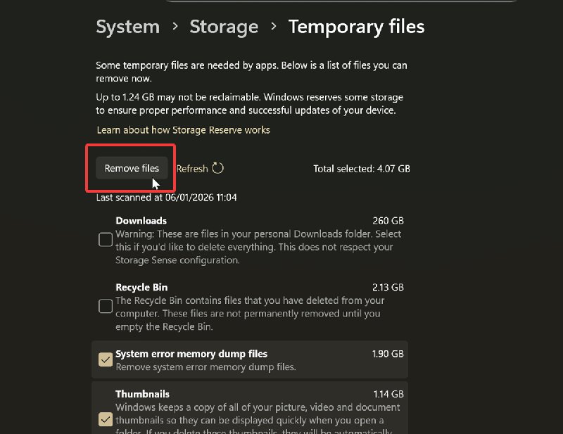 Additionally, some temporary files are needed by apps, so Windows reserves a bit of your storage for them. You'll see how much of the reserved storage you can't delete.