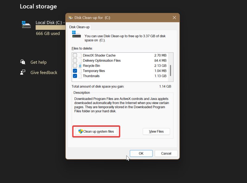 - You can also click on Clean up system files to be more thorough. This will include old update files, temporary installation files, and similar ones.