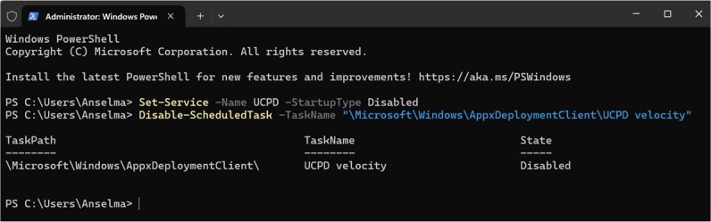 - schtasks /change /Disable /TN "\Microsoft\Windows\AppxDeploymentClient\UCPD velocity"
