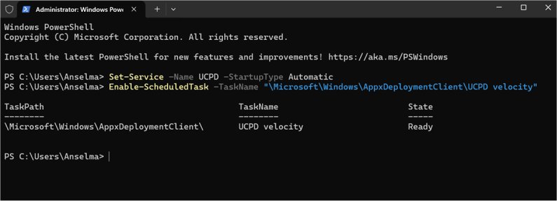 - schtasks /change /Enable /TN "\Microsoft\Windows\AppxDeploymentClient\UCPD velocity"