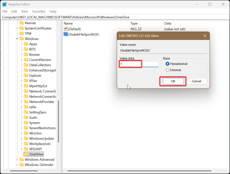 - Double-click DisableFileSyncNGSC and type 1 in the Value data field. Click OK.