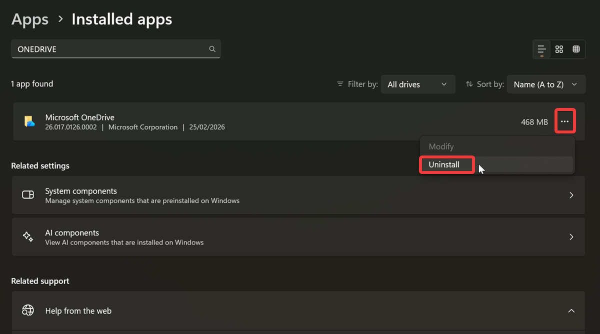 - Find Microsoft OneDrive on the list, and click the three dots next to it.