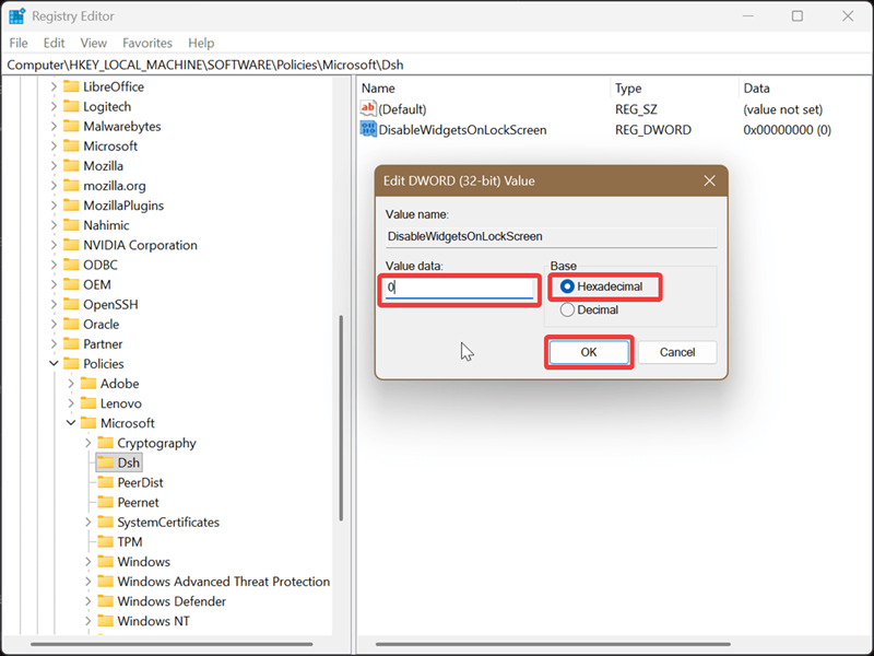 - Name it DisableWidgetsOnLockScreen, and double-click it.