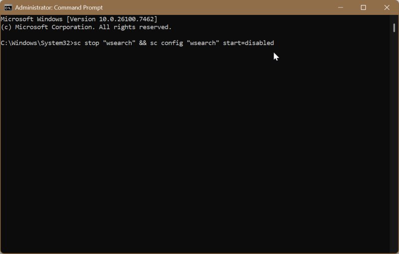 - Type the following command and press Enter: sc stop "wsearch" && sc config "wsearch" start=disabled.
