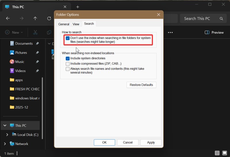 - Check Don't use the index when searching in file folders for system files (searches might take longer).