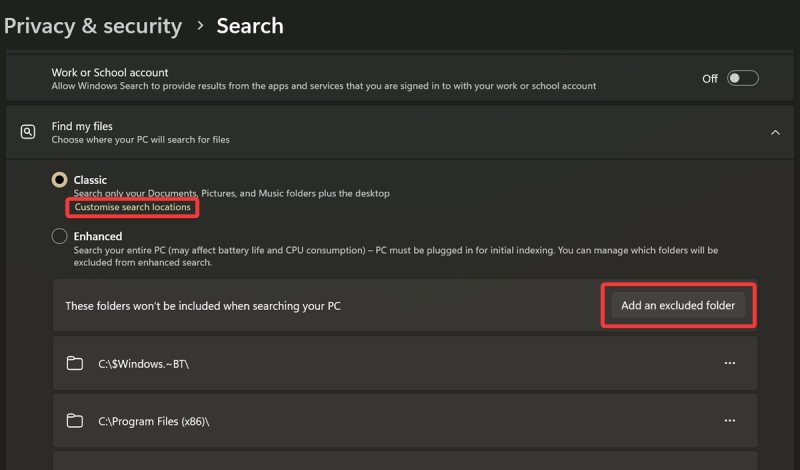 First, go to Settings > Privacy & security > Search. In the Find my files section, you can customize search locations for Classic mode and add more if needed. Or, you can select Add an excluded driver to limit Enhanced mode.