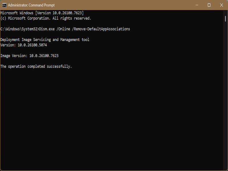 - Type the following command and press Enter: Dism.exe /Online /Remove-DefaultAppAssociations