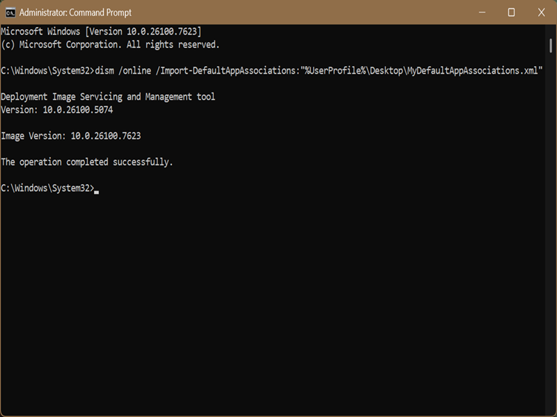 - Type the following command and press Enter: dism /online /Import-DefaultAppAssociations:"%UserProfile%\Desktop\MyDefaultAppAssociations.xml" (If the XML file isn't on your desktop, change the file path in the quote marks.)