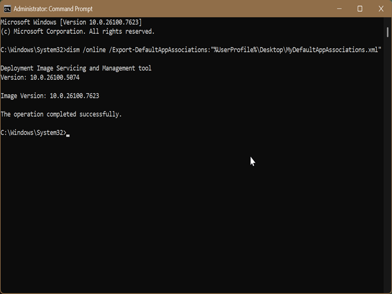 - Type the following command and press Enter: dism /online /Export-DefaultAppAssociations:"%UserProfile%\Desktop\MyDefaultAppAssociations.xml"