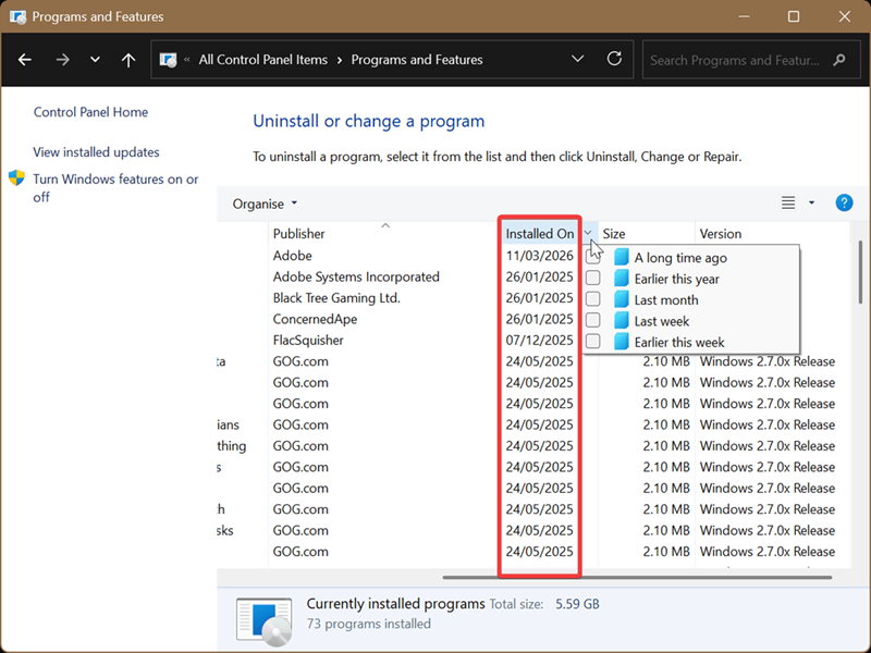 - Click the arrow next to it to sort them based on the time they were installed/modified: A long time ago, Earlier this year, Last month, Last week, Earlier this week.