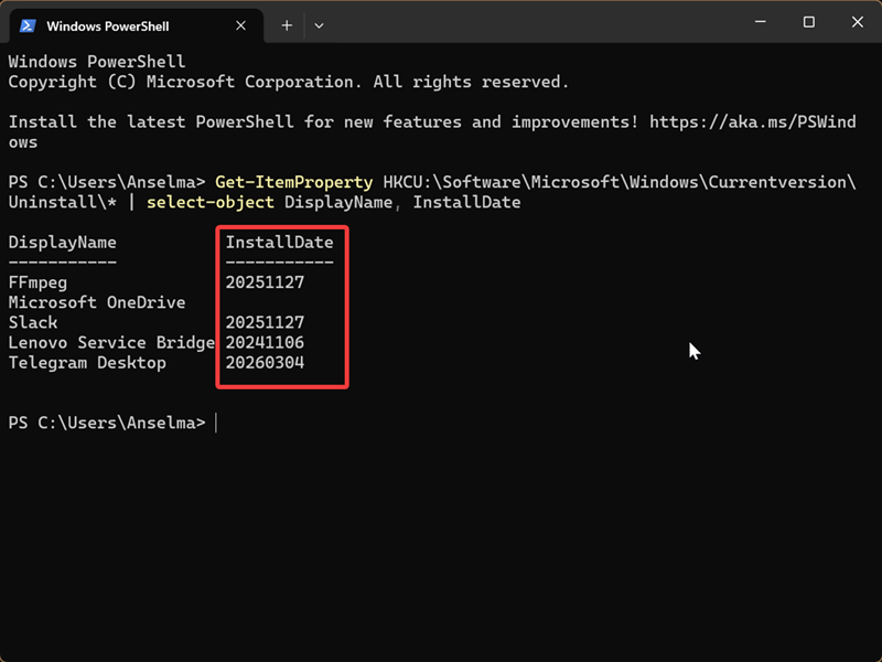 - For desktop apps installed for the current user: Get-ItemProperty HKCU:\Software\Microsoft\Windows\Currentversion\Uninstall\* | select-object DisplayName, InstallDate