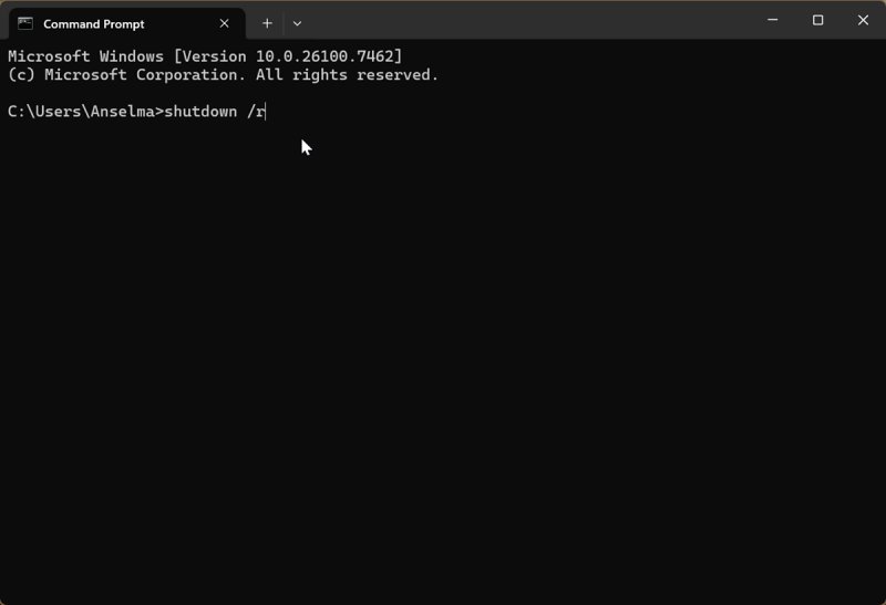 - Type the following command and press Enter: shutdown /r.