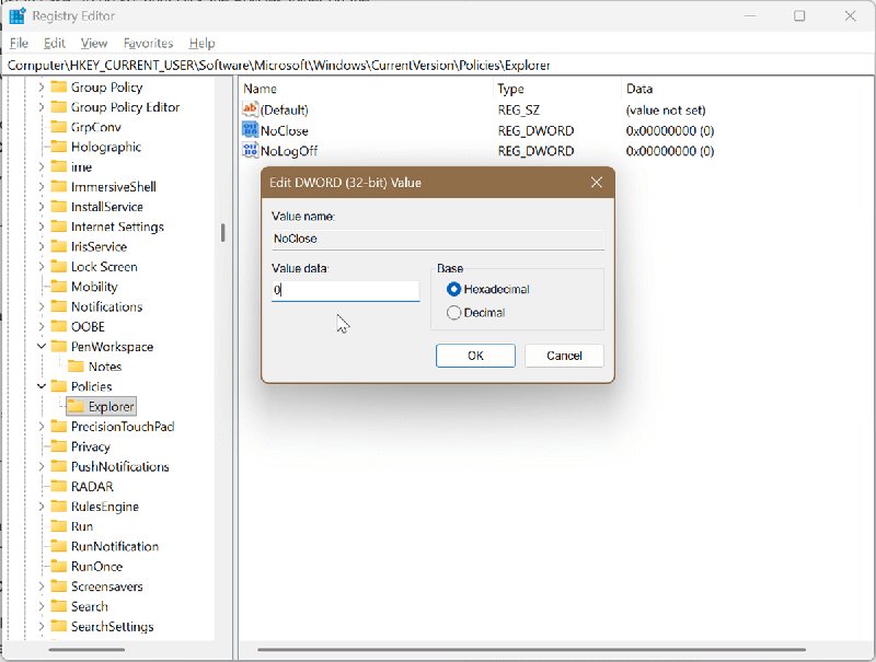 - Right-click the newly-created Explorer subfolder, and select New > DWORD (32-bit) Value. Name it NoClose. The default value should be 0, so you don't need to change it.
