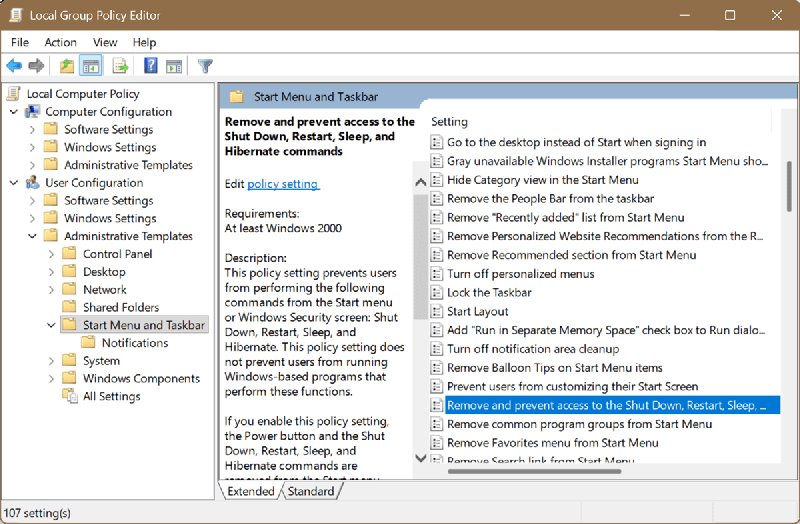 - On the right side, find and double-click Remove and prevent access to the Shut Down, Restart, Sleep, and Hibernate commands.
