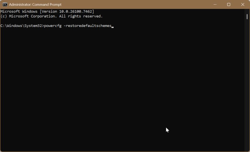 - Type the following command and press Enter: powercfg -restoredefaultschemes.