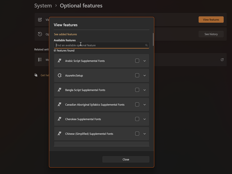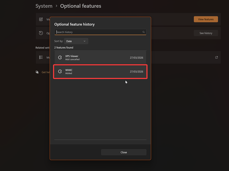 You should then be able to find WMIC in your added features when you click on View features. You can also confirm it's been installed by clicking on See history.