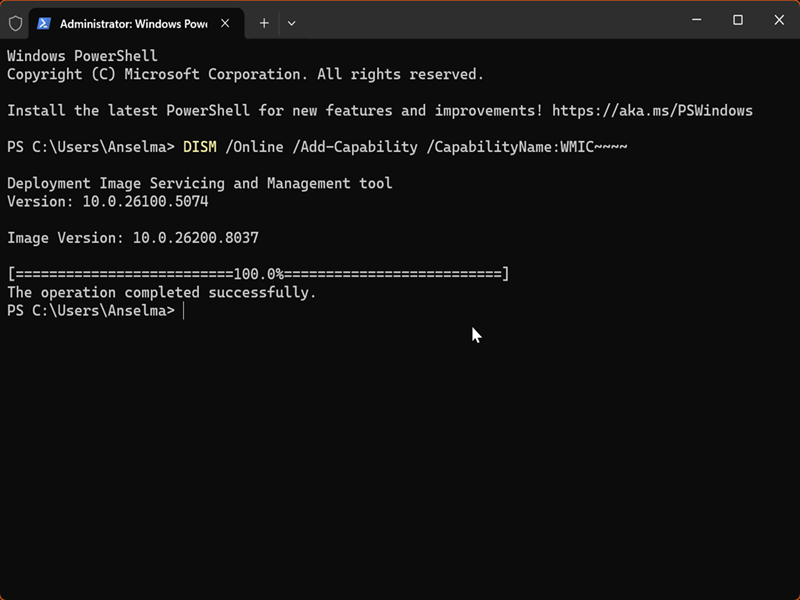 Alternatively, you can use either Command Prompt or PowerShell to install WMIC. Like in the previous method, you should sign in as an admin first.