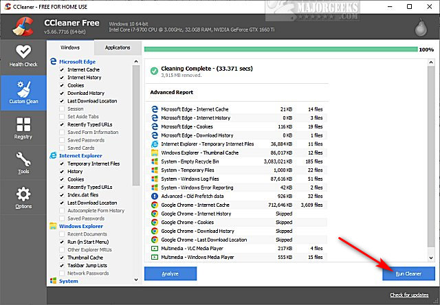 Optional: The Custom Clean section has two categories; Windows and Applications. You can browse both to see if there's anything you want or don't want to clean. You can click on Analyze to see the results before cleaning.