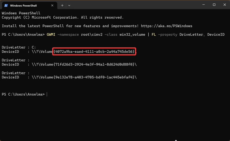 - Type the following command and hit Enter: GWMI -namespace root\cimv2 -class win32_volume | FL -property DriveLetter, DeviceID