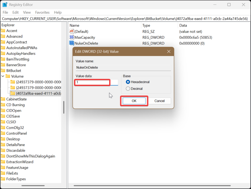 This will, as the value name suggests, "nuke" files as soon as you click on Delete. If you want to undo this change, just type 0 instead and then click OK.