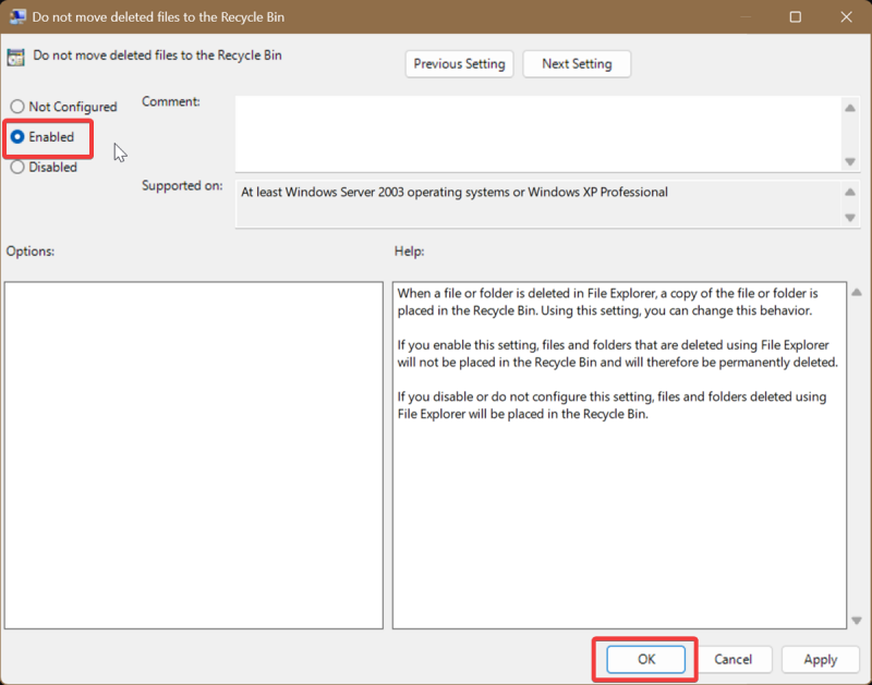 Simply select Not Configured and hit OK after double-clicking Do not move deleted files to the Recycle Bin. That's the default setting for this policy.