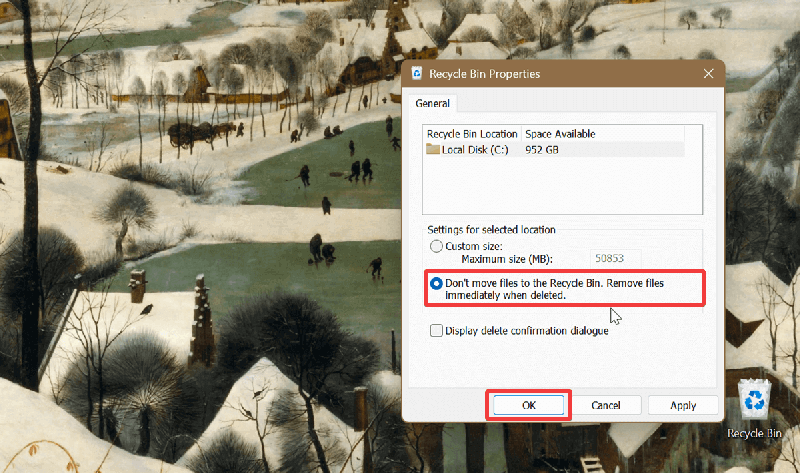 - Select Don't move files to the Recycle Bin. Remove files immediately when deleted.