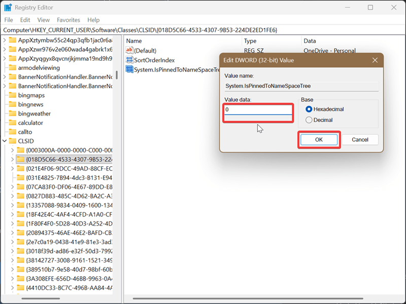 - In the Value data field, type 0 and click on OK to remove OneDrive from the navigation pane.