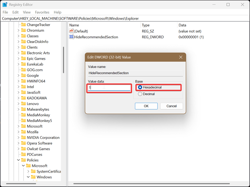 - Double-click it to configure it. Select Hexadecimal as the base, and type 1 in the Value data field. Click on OK.