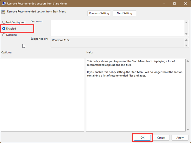 This will fully remove the Recommended section, and you won’t be able to bring it back with the Settings.