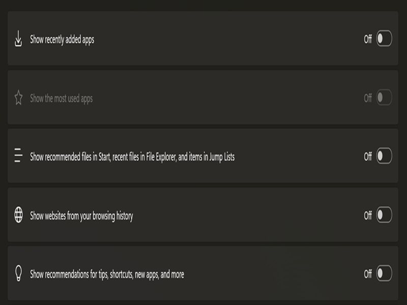 As you can see, there isn’t one big button you can press to remove it altogether. But once you disable all these options, you should see no more recommendations in the Start menu.