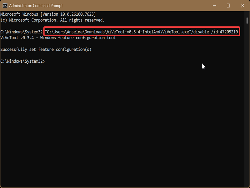 - Press Ctrl + V to paste the file path you just copied, and add the following: /disable /id:47205210. Hit Enter. The full command should look like this: "C:\Users\Anselma\Downloads\ViVeTool-v0.3.4-IntelAmd\ViVeTool.exe" /disable /id:47205210. Your file path will be different, of course.