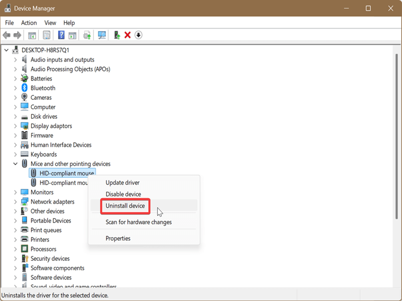 - Right-click the device and select Uninstall device. Alternatively, you can select the device and click on Action in the menu bar, then Uninstall device.