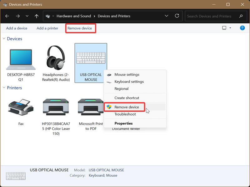 - Right-click the one you want to uninstall, and select Remove device. Or, select the device and then click Remove device on the toolbar.