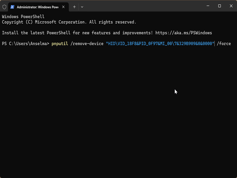 - Type the following command and press Enter: pnputil /remove-device "