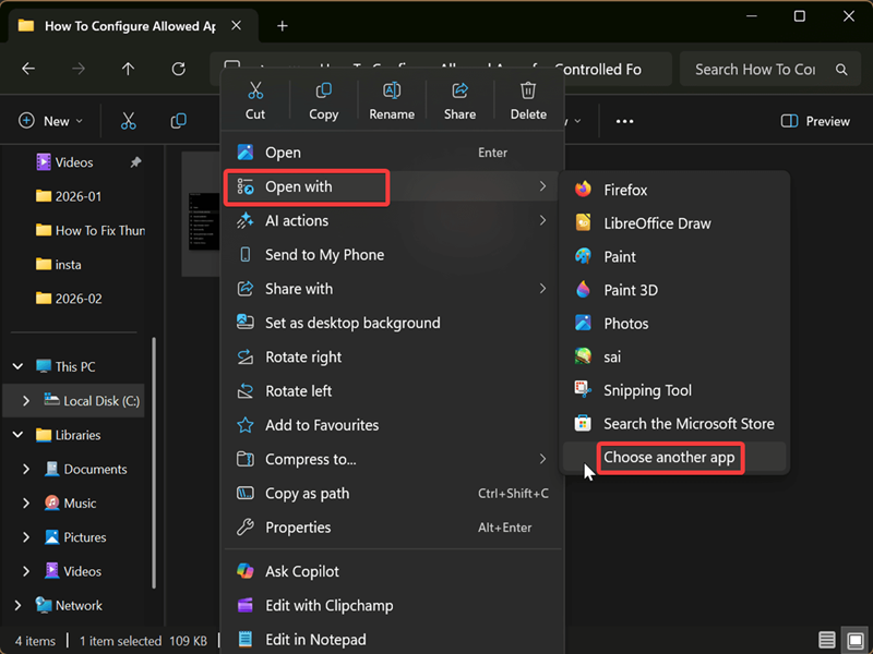 - If there is an assigned default app, select Choose another app. Click on a suggested program from the list, Browse apps in the Microsoft Store, or Choose an app on your PC. Once you make your choice, click on Always.