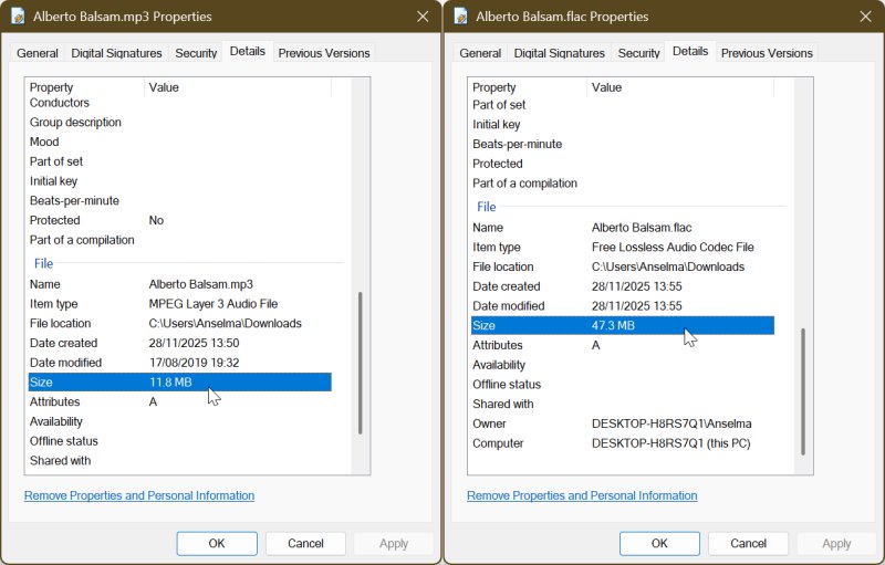 Aphex Twin's "Alberto Balsam" as a 320kbps MP3 file is 11.8 MB. However, as a FLAC, it's 47.3 MB. And that's just one song - imagine the album size difference!