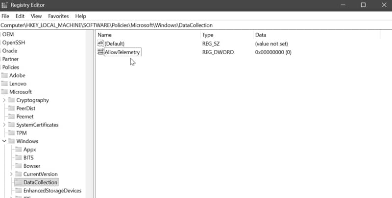 - On the left side, you'll see a list of folders. Go to HKEY_LOCAL_MACHINE\SOFTWARE\Policies\Microsoft\Windows\DataCollection.